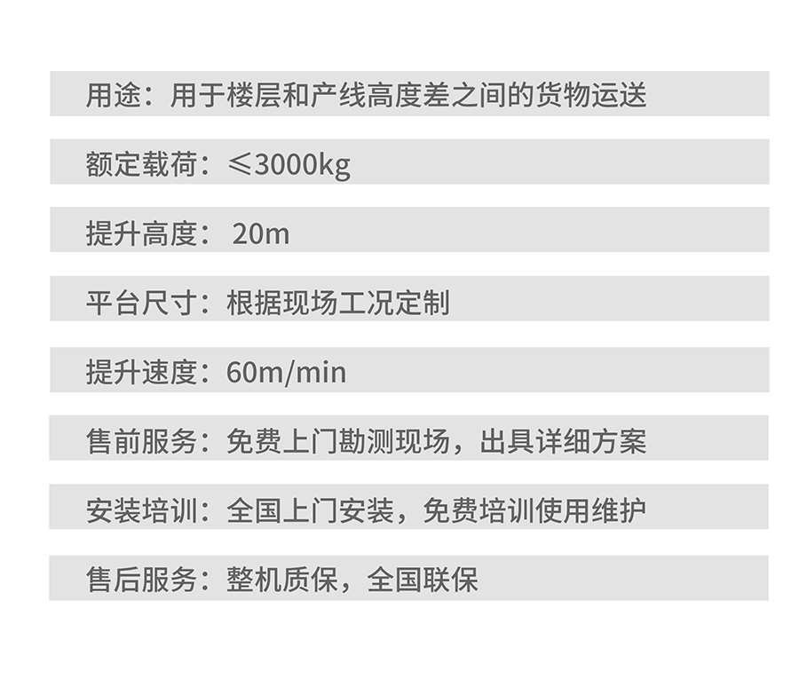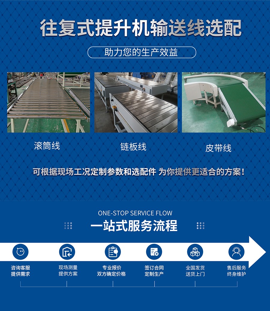 往復(fù)式提升機(jī)是由鏈條帶動,通過變頻調(diào)速控制電機(jī),便提升轎廂上下往復(fù)運(yùn)動.提升轎廂上配有傳動機(jī)構(gòu),以便被輸送物自動進(jìn)入升降機(jī)的提升轎廂上。該類提升機(jī)具有控制先進(jìn),性能可靠,提升轎廂定位精度高等特點(diǎn)。